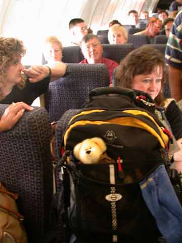 I had to make a phone call to take care of some lose ends that I left behind in Jeffersonville, and I'd rather not go into what happened, all I'm going to say is you can do that in Indiana! (I heard that the Cincinati jails are none to hospitable, lets just leave it at that!). It was decided that I would spend the rest of the flight in Kim's backpack....