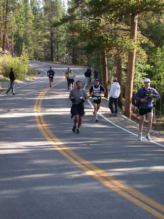 Runners coming off the trail on to the short run on the road to the Fish Hatchery/Outward Bound Aid Station