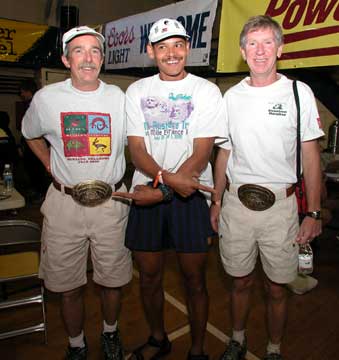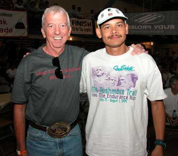 Jose is pointing at their 1000 mile buckles that they have received for completing Leadville 10 times